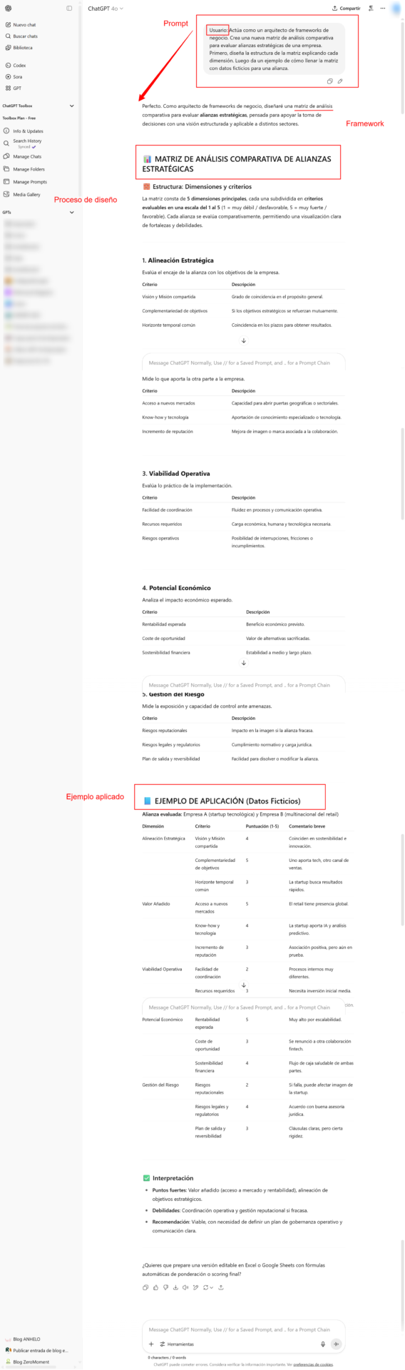 Explicación: Este prompt emplea meta-prompting implícito al pedir al modelo que diseñe un framework. Se solicita un proceso de diseño (estructura) antes de un ejemplo aplicado. El modelo deberá “inventar” la matriz (nuevas columnas/filas) y luego demostrarse con ejemplos. Esto lleva al modelo a actuar como generador de frameworks, una tarea avanzada donde combina capacidad creativa con estructuración lógica.