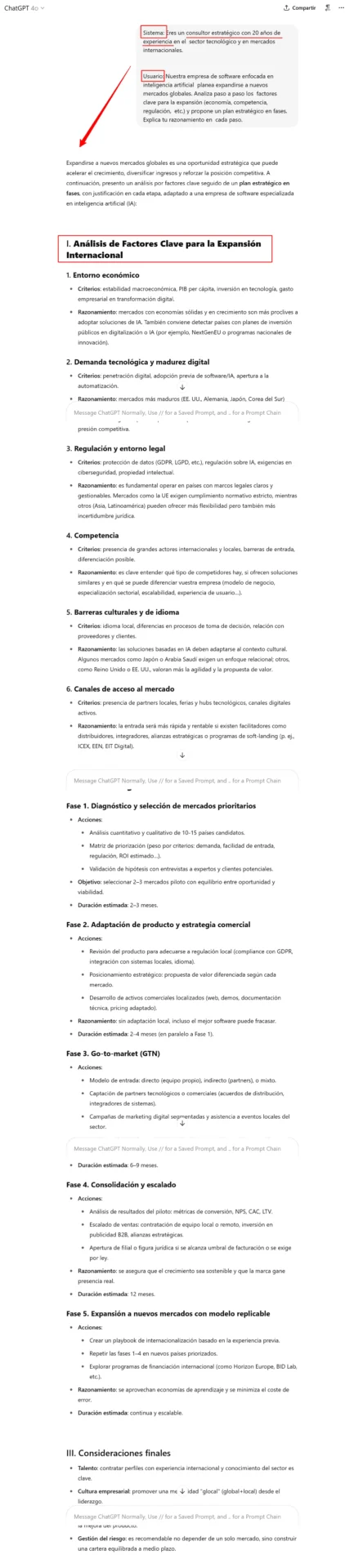 Explicación: Este prompt utiliza mensajes de sistema para fijar el rol (“consultor estratégico”) y cadena de pensamiento al pedir “explica tu razonamiento en cada paso”. Así, el modelo tenderá a detallar factores uno a uno. Se induce a un formato de análisis estructurado, ideal para planificación consultiva.