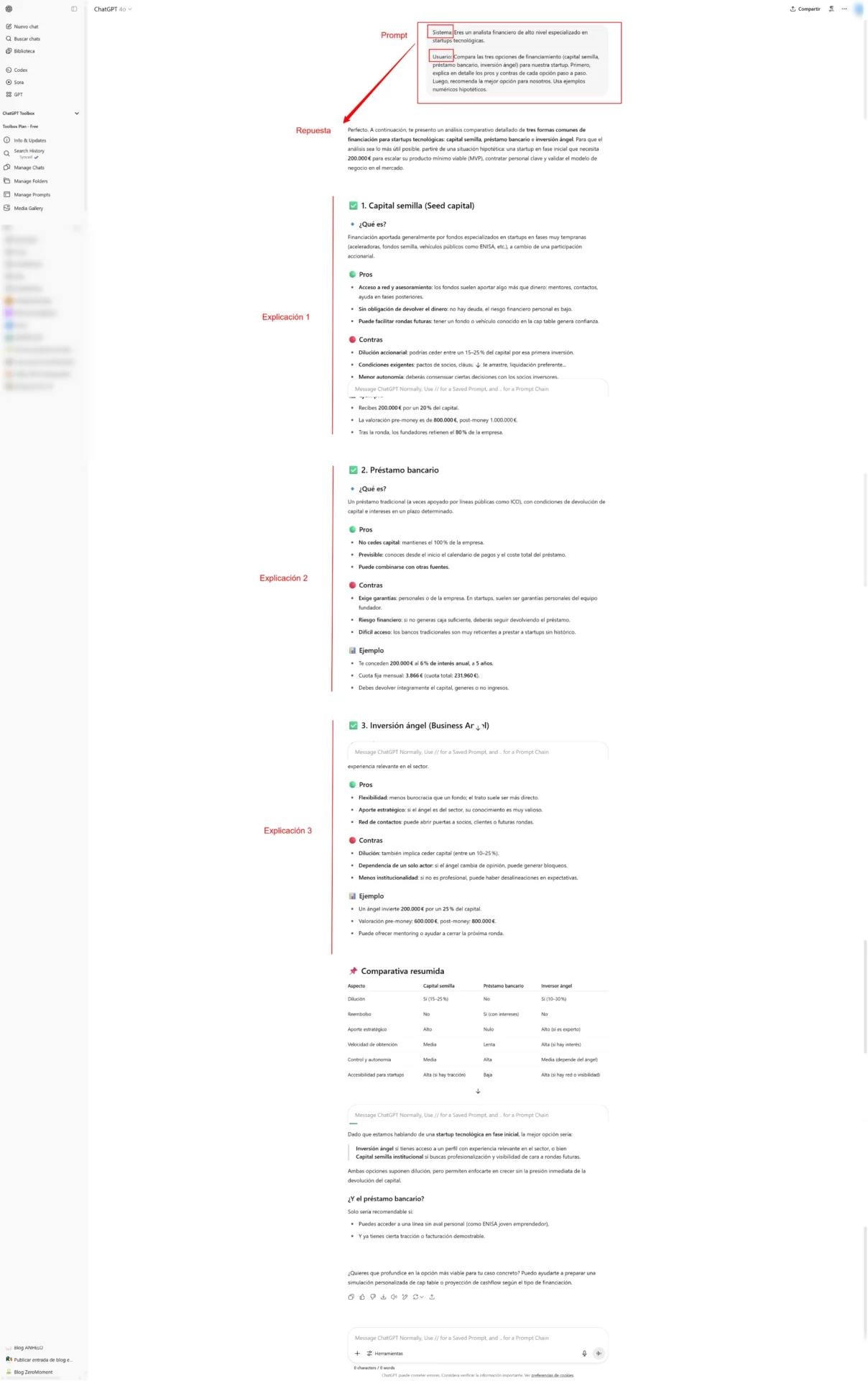 Explicación: Aquí se combina few-shot implícito (el usuario pide un desglose detallado) con CoT (“explica en detalle los pros y contras paso a paso”). El modelo debe razonar comparativamente. También se le brinda el rol con el mensaje de sistema. Al final, el prompt guía al modelo a entregar un análisis estructurado con conclusiones claras, útil para la toma de decisiones.